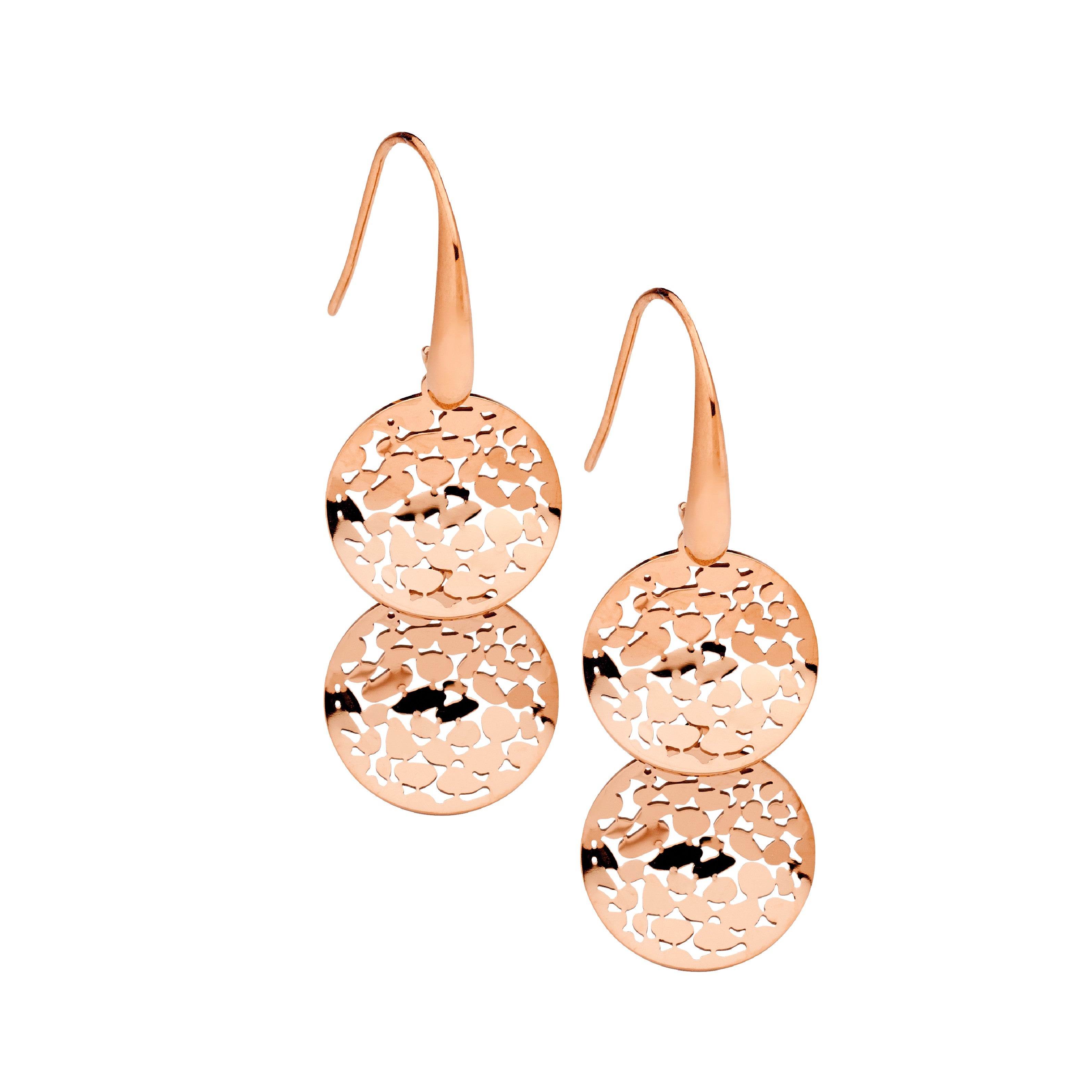 Delicate and modern, these stainless steel drop earrings feature two wave-textured disk charms on shepherd hooks, finished with warm rose gold ion plating. The soft glow and graceful movement make them perfect for elevating everyday wear or adding subtle sophistication to special occasions. A stylish and feminine addition to any jewellery collection.