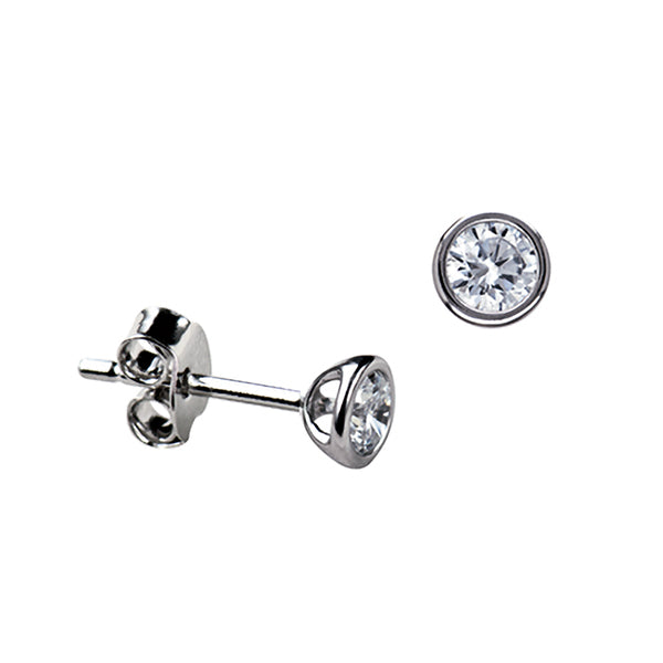 These sterling silver stud earrings feature a 3mm cubic zirconia securely bezel set for a smooth, streamlined finish. Subtle in size, they offer a refined look that works well for daily wear or multiple piercings. A classic essential for any jewellery collection.
