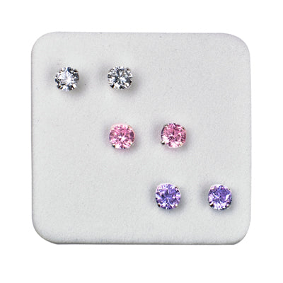 This sterling silver 4mm stud earring set includes three pairs of cubic zirconia studs in pink, white, and lavender. Small and lightweight, each pair is designed for comfortable everyday wear and easy styling. A versatile set that complements both fine and fashion jewellery collections.