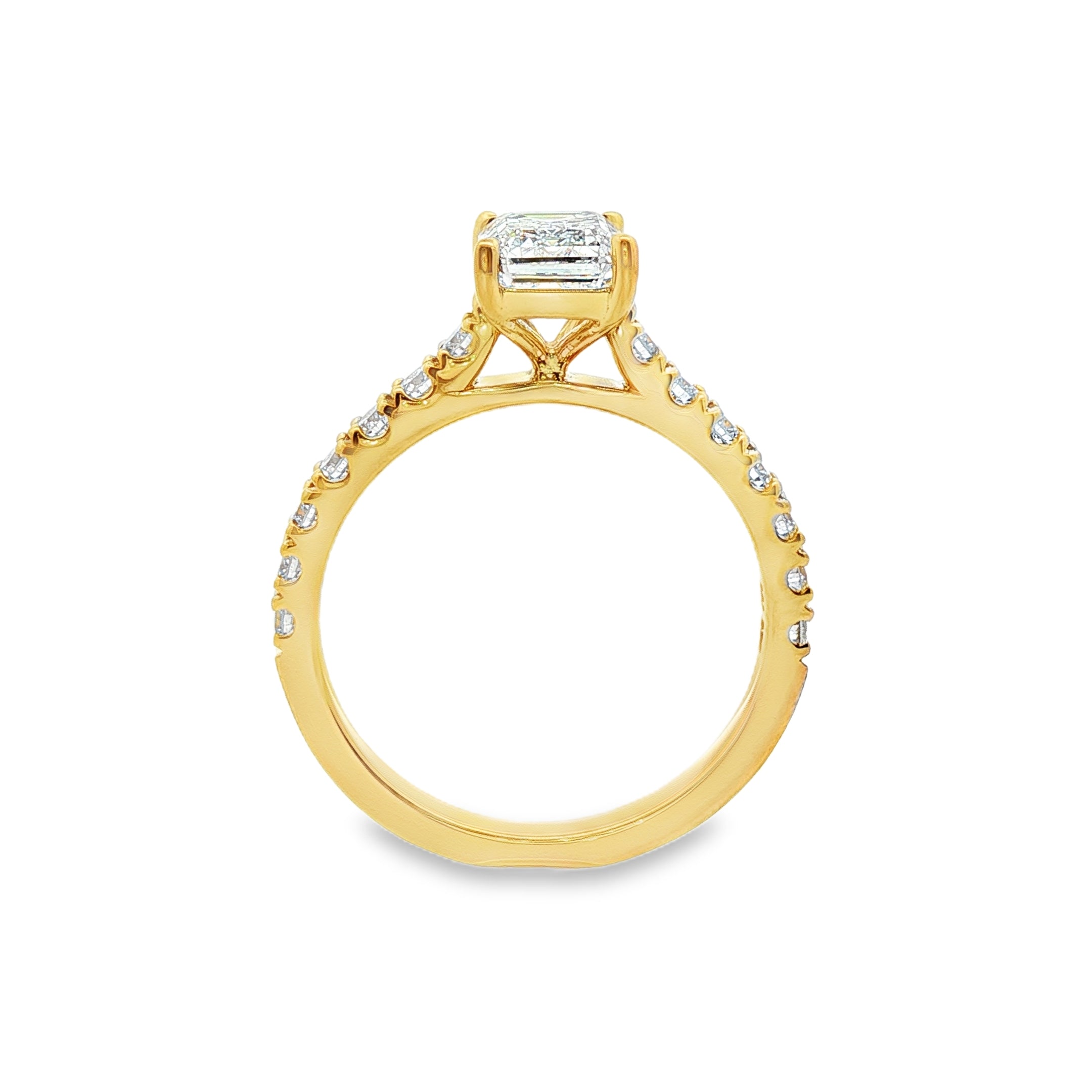 This elegant 9ct yellow gold ring features a 1.55ct emerald cut lab grown diamond as the centrepiece, secured by a classic four eagle claw setting. Accentuated by 14 round brilliant lab grown diamonds totalling 0.42ct on the shoulders, this design balances sophistication and sparkle. A timeless choice with modern brilliance.