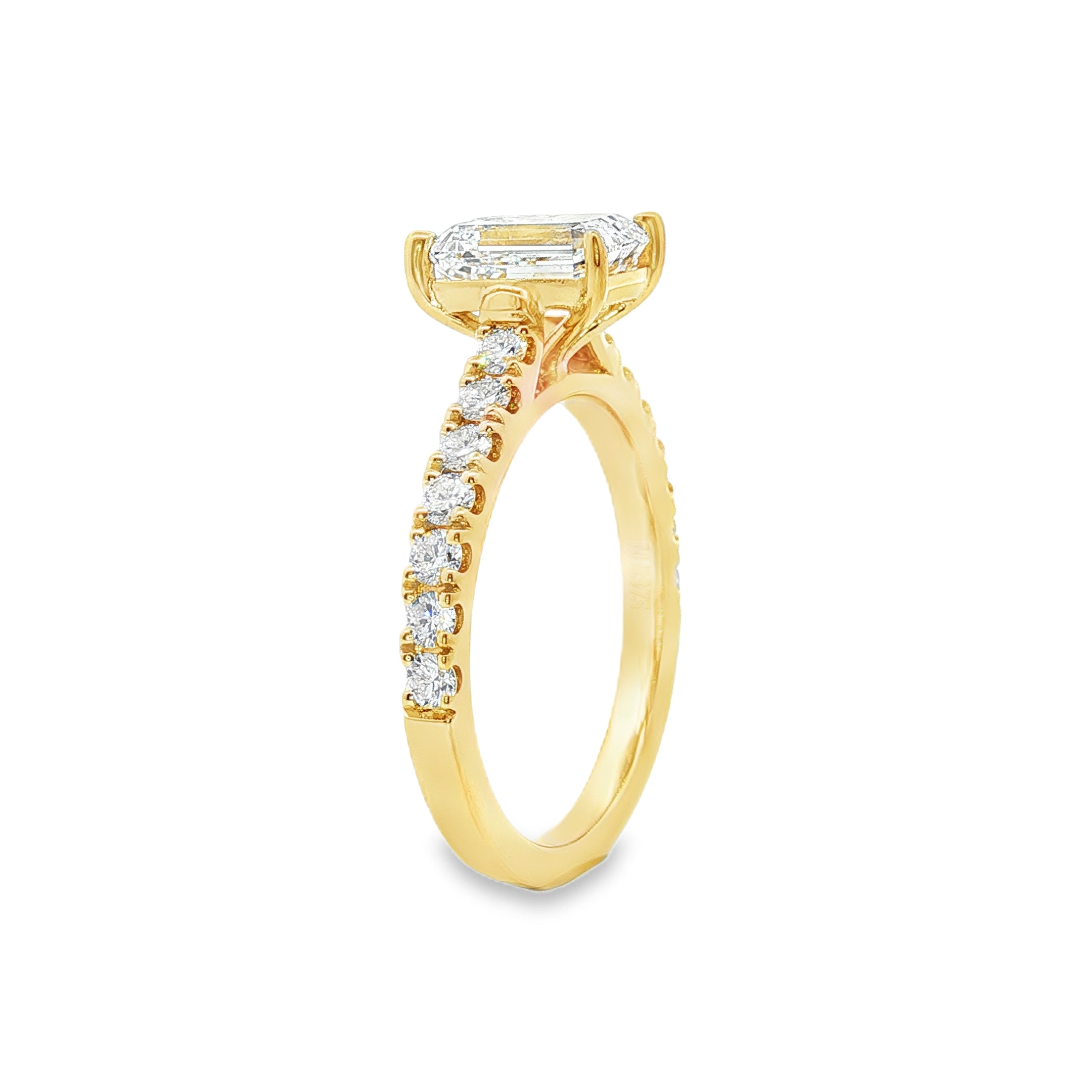 Crafted in 9ct yellow gold, this refined ring showcases a 1.55ct emerald cut lab grown diamond held in a secure four eagle claw setting. Complementing the centrepiece are 14 round brilliant lab grown diamonds on the shoulders, adding a total of 0.42ct of extra sparkle and elegance. A modern statement with timeless charm.