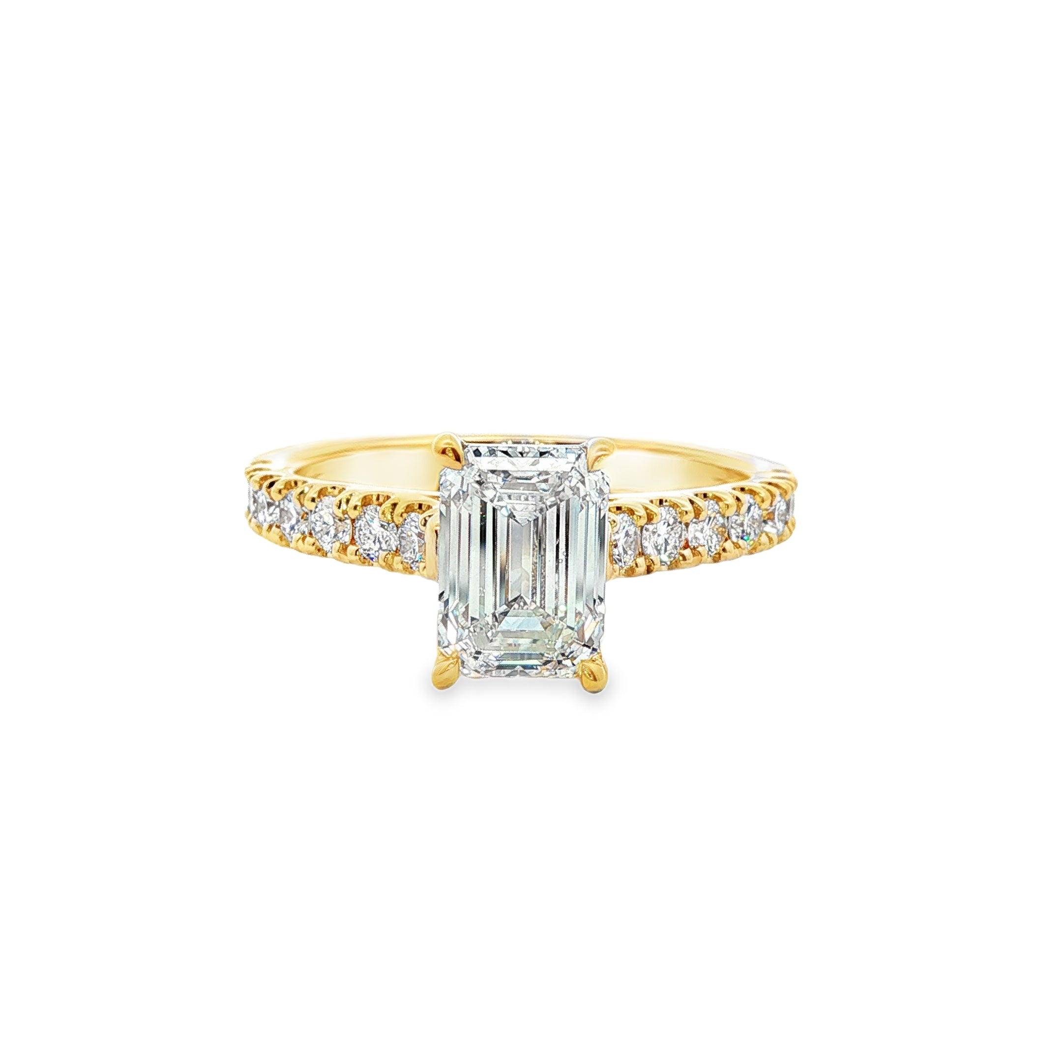 This elegant 9ct yellow gold ring features a striking 1.56ct emerald cut lab grown diamond in a secure four eagle claw setting. The shoulders are adorned with 14 round lab grown diamonds, adding extra brilliance and a touch of modern sophistication.
