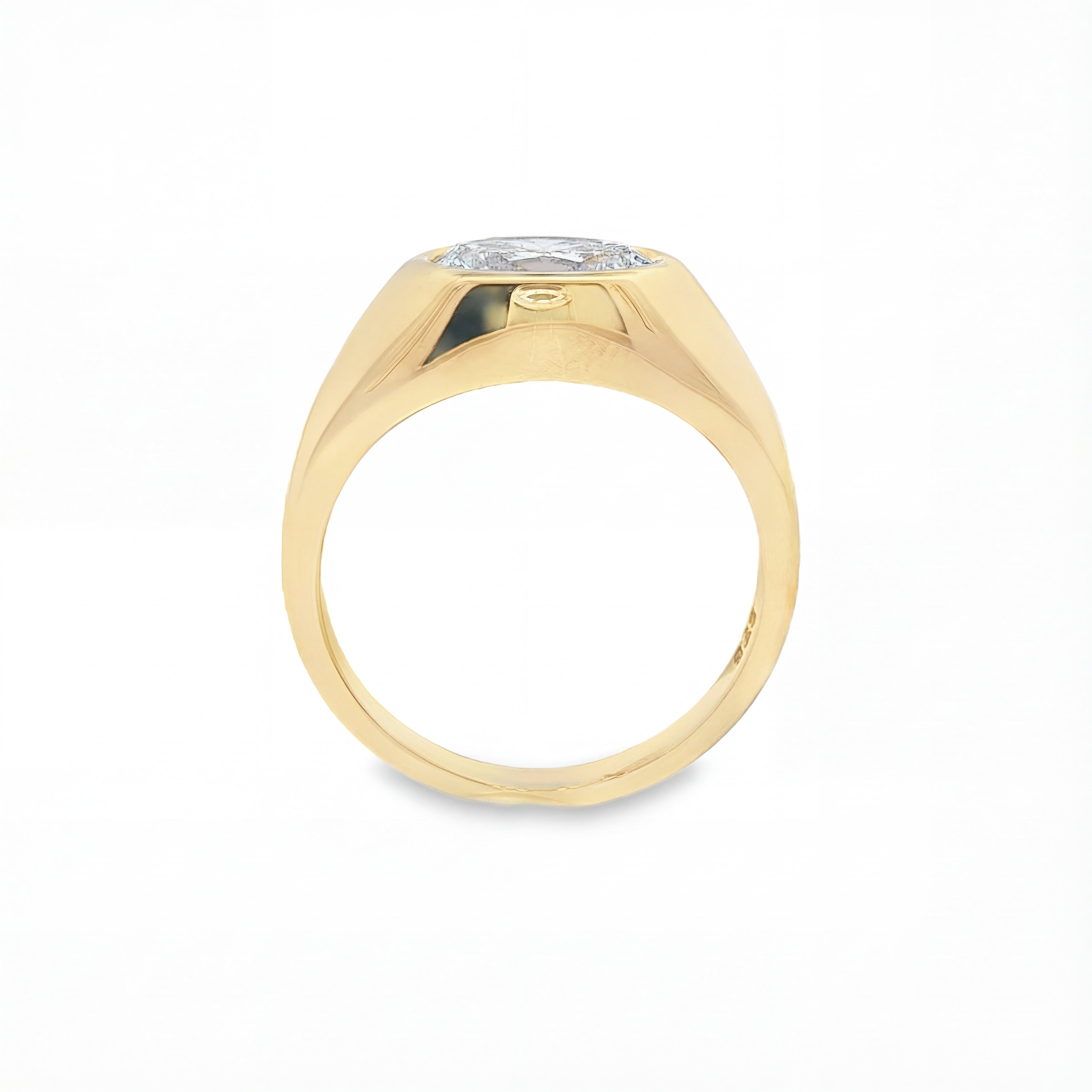 Crafted in warm 9ct yellow gold, this wide shoulder ring showcases a 1.50ct oval cut lab grown diamond in a smooth bezel setting. The elegant E colour and VS1 clarity of the diamond offer a refined brilliance, making this piece a timeless yet contemporary statement.