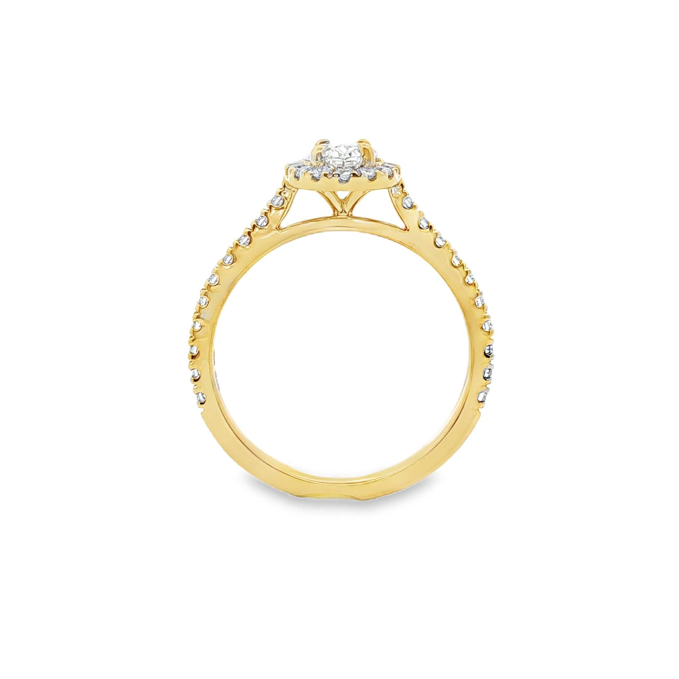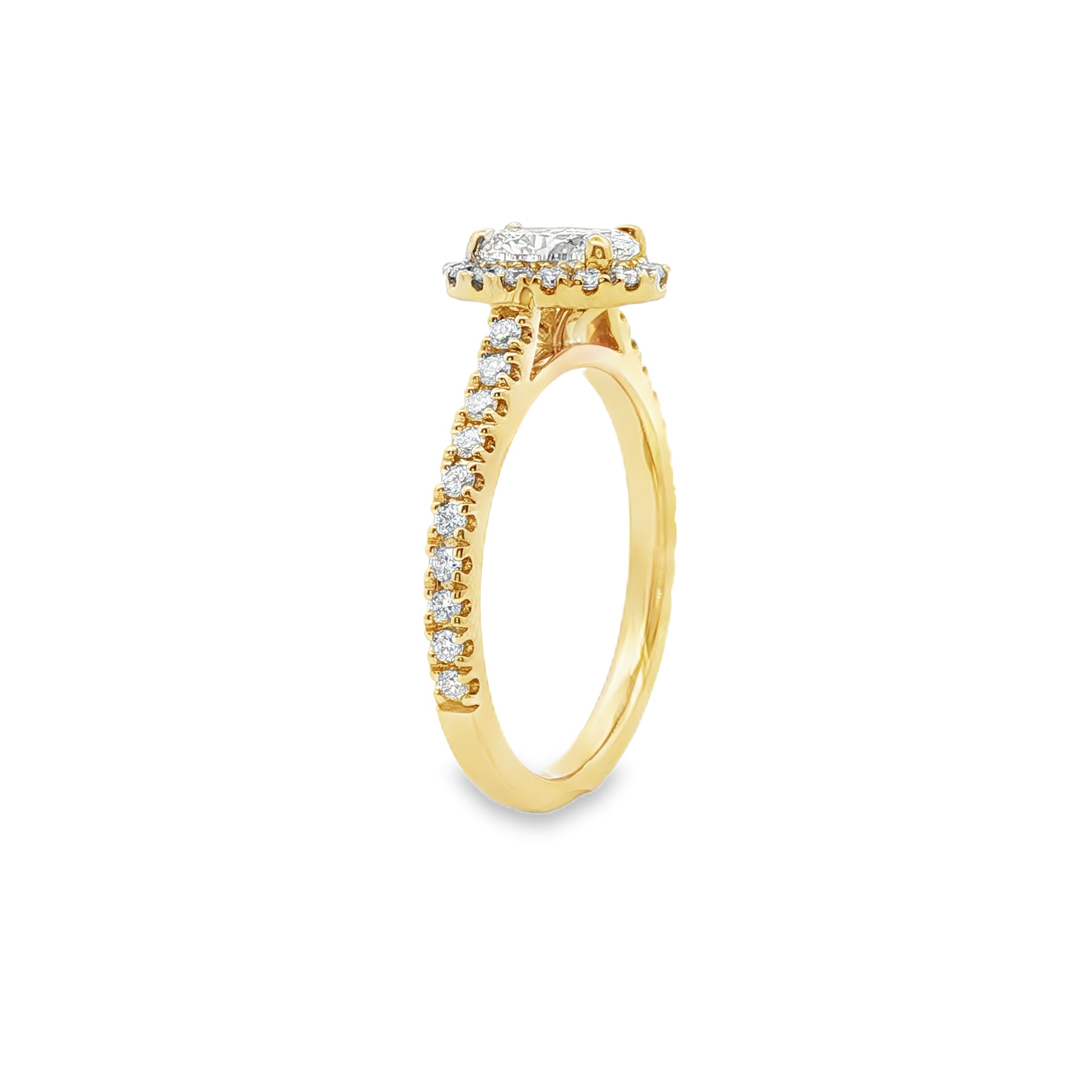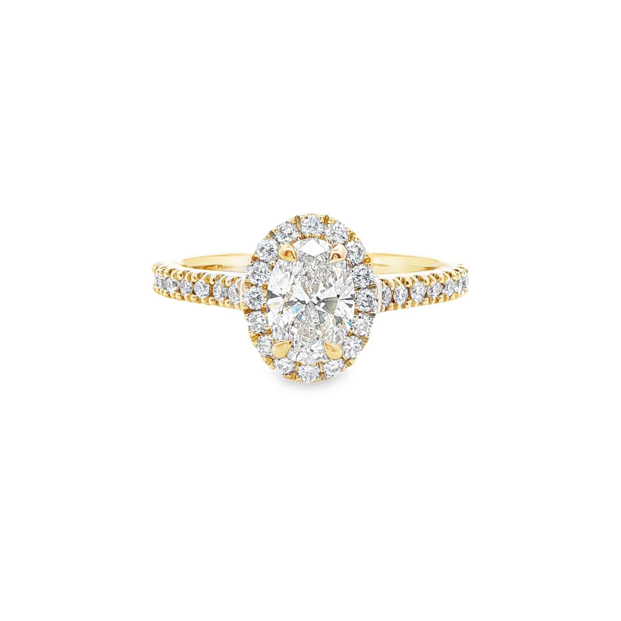 This timeless 9ct yellow gold ring features a 0.75ct F+ VS+ oval cut lab grown diamond in the centre, surrounded by a radiant halo of 16 round lab grown diamonds totalling 0.25ct. The sparkle continues along the shoulders with 20 additional stones totalling 0.30ct, bringing the total diamond weight to approximately 1.30ct.