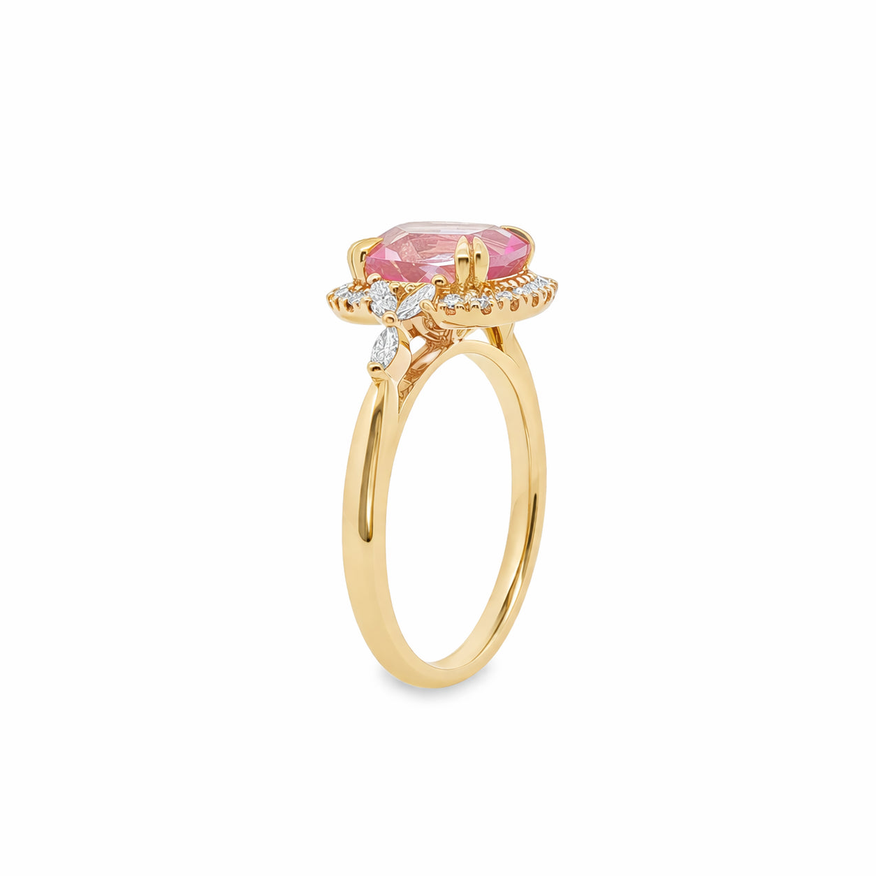 Vibrant and elegant, this 9ct yellow gold ring features a stunning 9x7mm pink tourmaline secured in a distinctive double eagle claw setting. The centre stone is surrounded by a sparkling halo of round lab grown diamonds, complemented by marquise cut lab grown diamonds along the shoulders, creating a beautifully balanced and eye-catching design.
