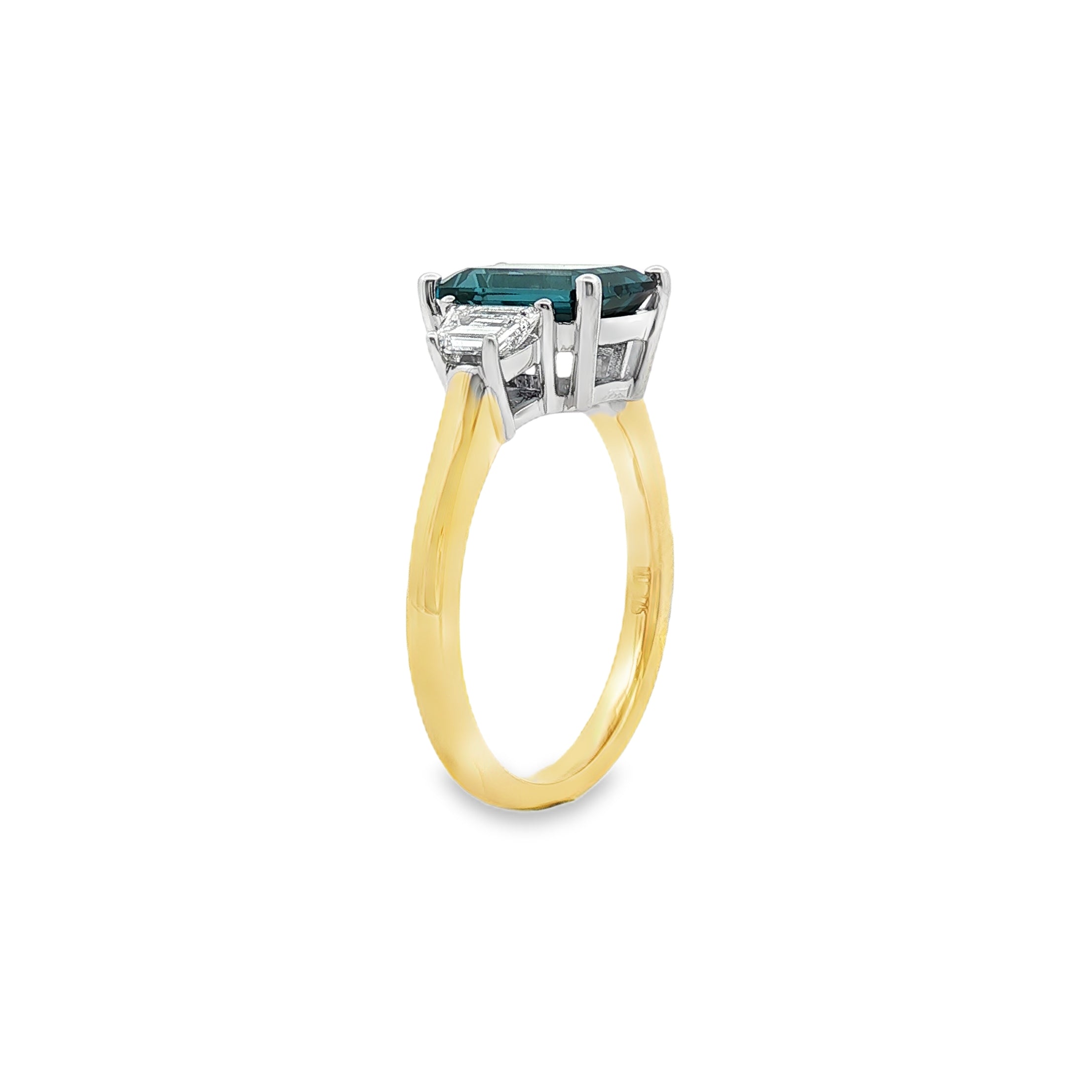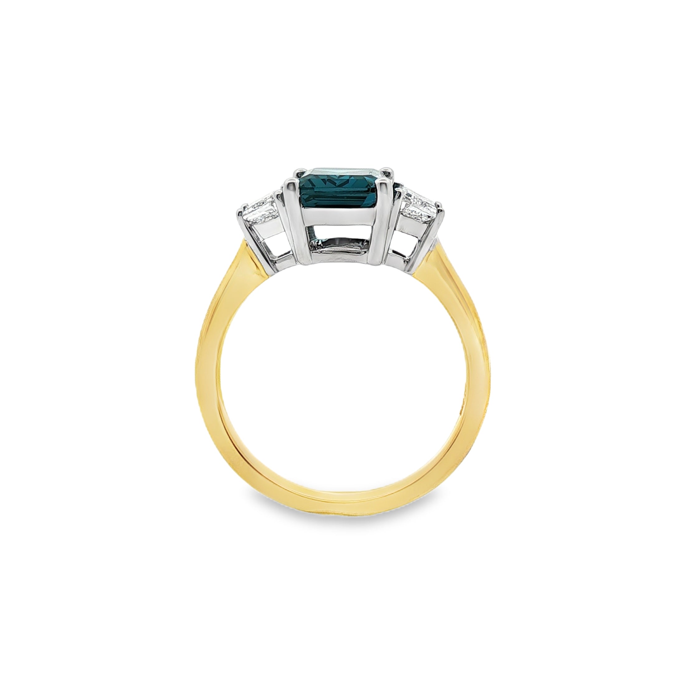 Striking and architectural, this two-tone trilogy ring features a bold 9x7mm emerald cut London Blue Topaz secured in a crisp 4 claw white gold setting. Trapezoid cut lab grown diamond side stones add clean lines and balanced sparkle, beautifully framed by a yellow gold band for contrast and depth.