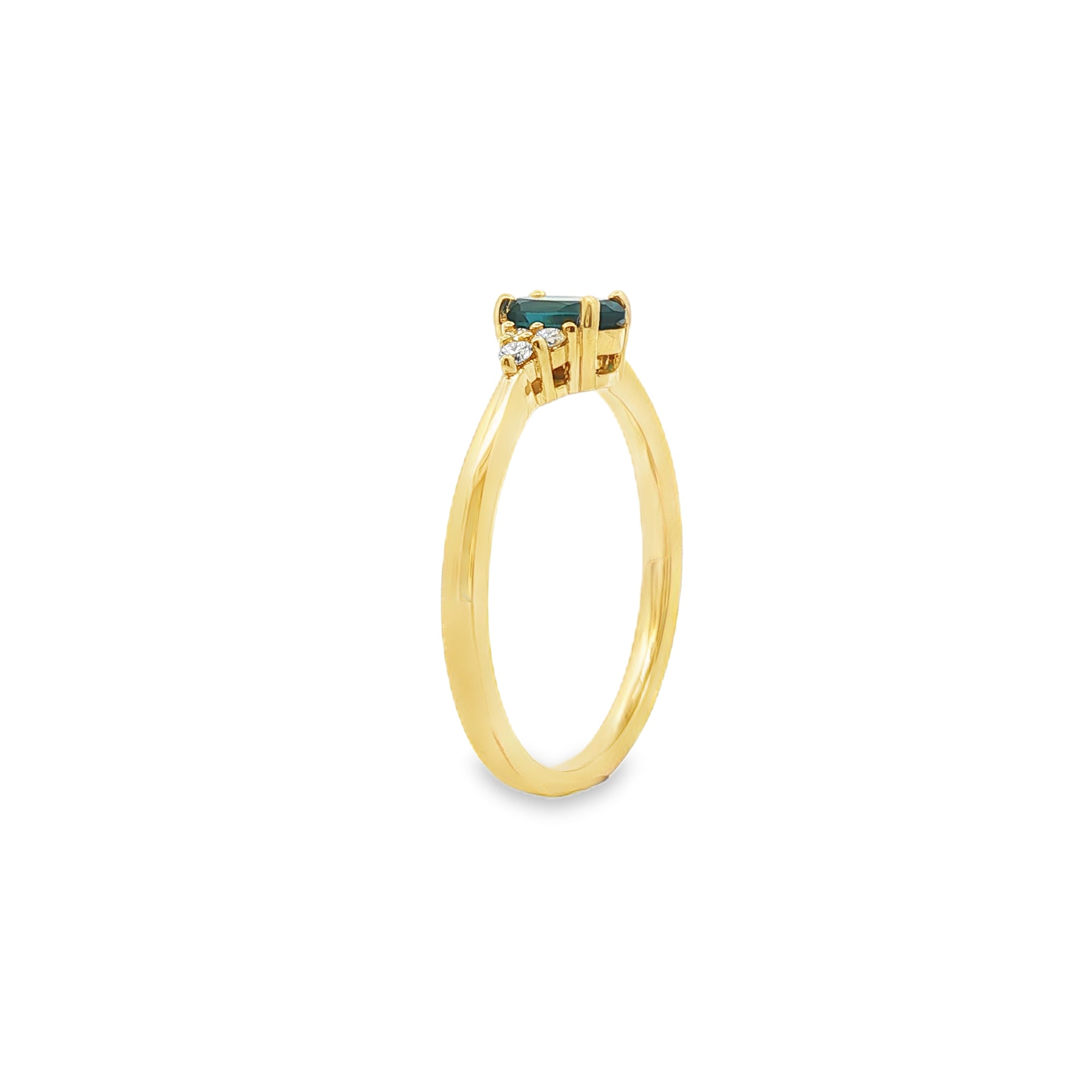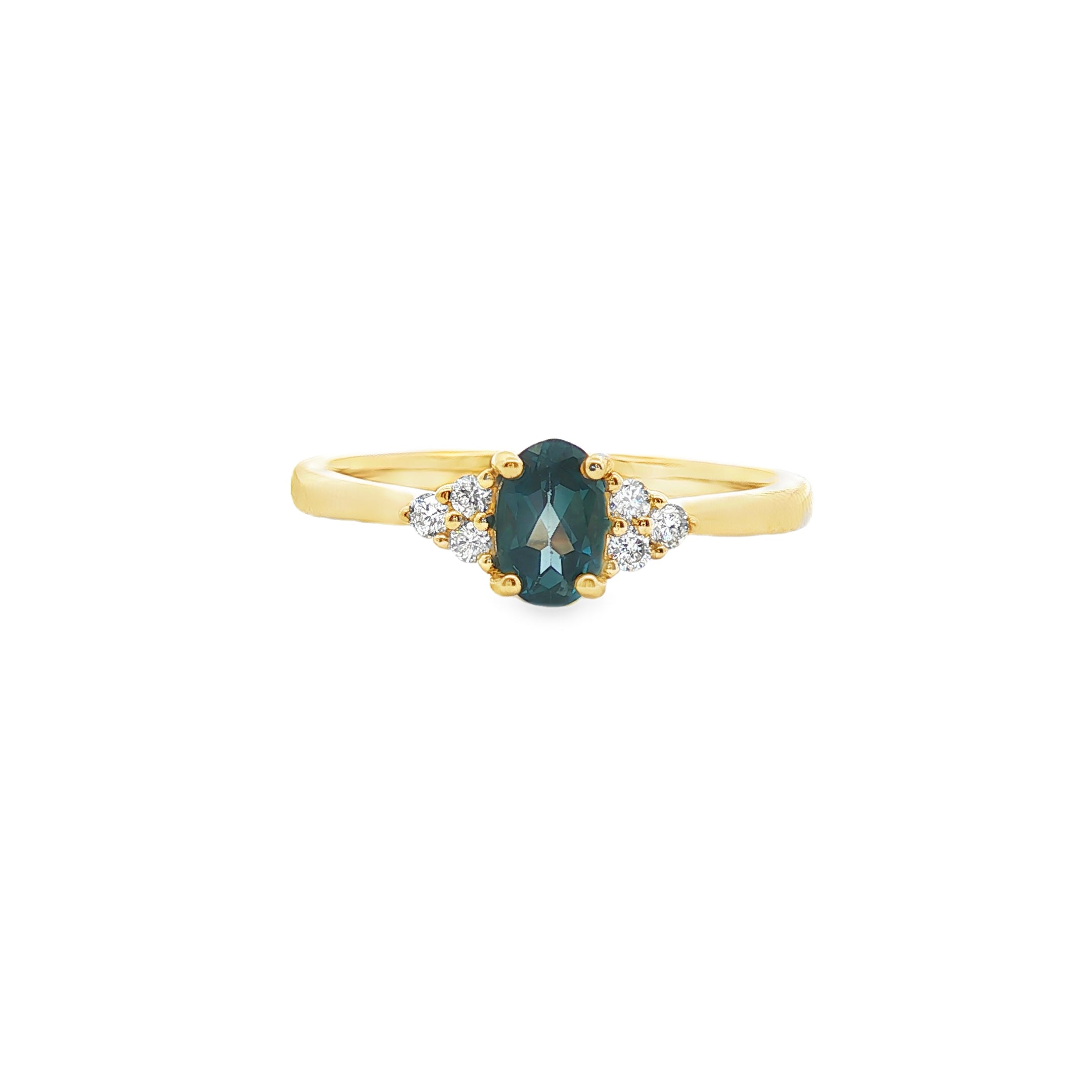 Rich in colour and classic in design, this 9ct yellow gold ring features a 6mm x 4mm oval London Blue Topaz secured in a timeless 4 claw setting. Trio cluster shoulders set with lab grown diamonds add balanced sparkle, enhancing the depth of the centre stone while keeping the look refined and wearable.