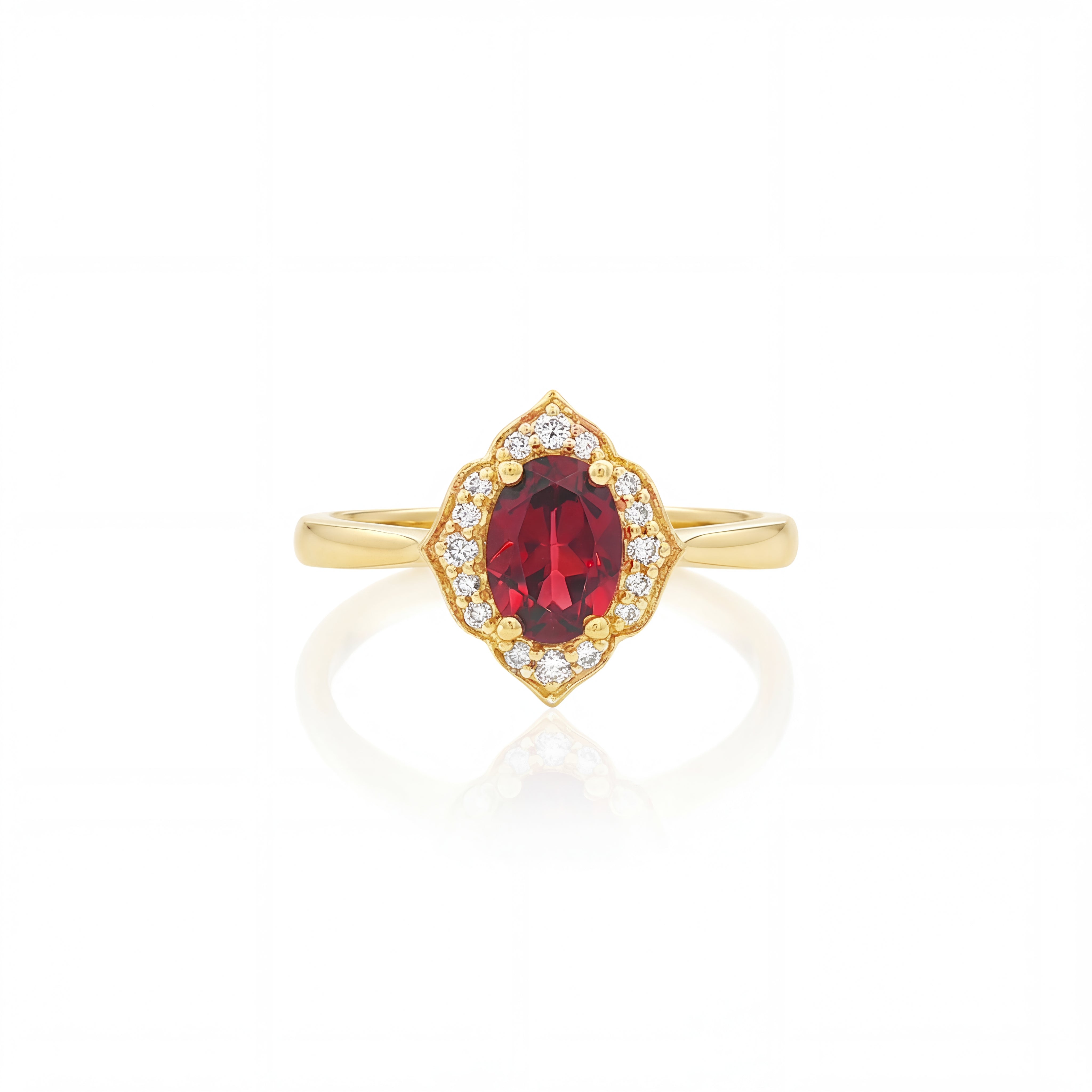 9ct Yellow Gold 4 Claw Set Oval Garnet Ring with Antique Style Lab Grown Diamond Halo – 0.10ct TDW