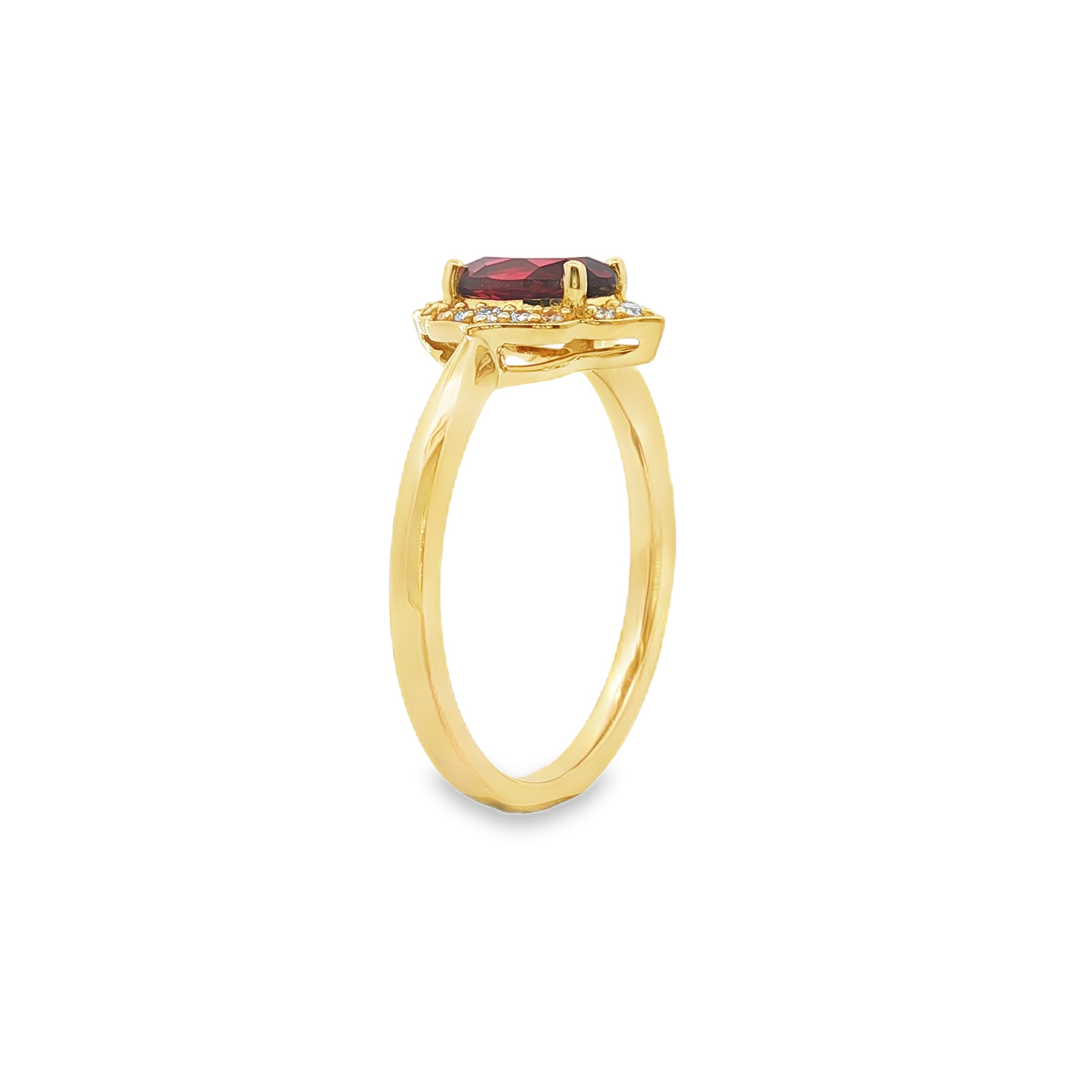 Rich and timeless, this 9ct yellow gold ring features a 7x5mm oval garnet secured in a classic 4 claw setting. An antique style halo of lab grown diamonds surrounds the centre stone, adding soft sparkle and vintage-inspired character that beautifully enhances the deep red tones of the garnet.