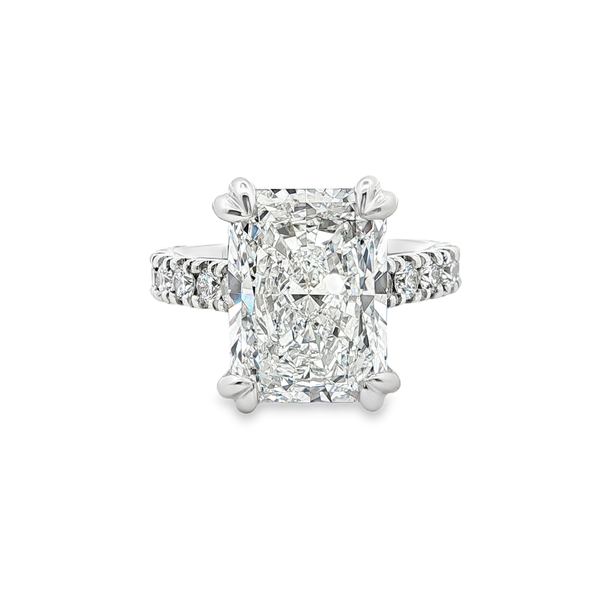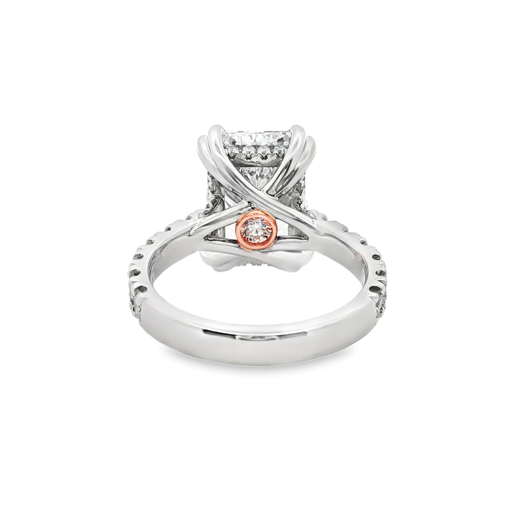 A breathtaking statement of brilliance and craftsmanship. This 18ct white gold ring features a double claw set 6.04ct radiant cut E VVS2 IGI-certified lab grown diamond at its centre, surrounded by a hidden halo and shoulders adorned with 34 F+ VS+ lab grown diamonds totalling 1.00ct. A delicate 0.12ct round F+ VS+ lab grown diamond is bezel set in rose gold beneath the setting as a peekaboo accent, adding an enchanting final touch.