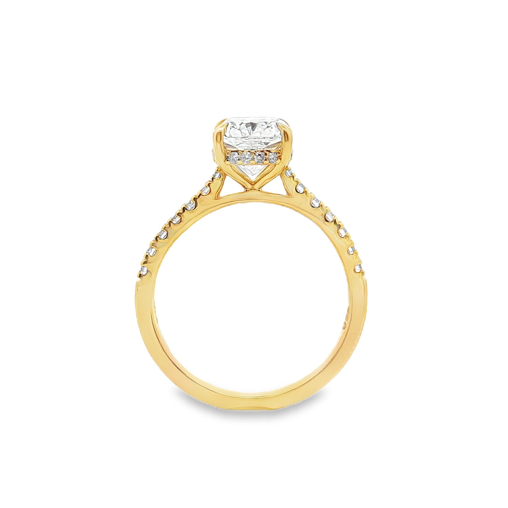 Luxurious and beautifully detailed, this 18ct yellow gold ring features a stunning 2.53ct elongated cushion cut lab grown diamond secured in a classic 4 eagle claw setting. A delicate hidden halo of round lab grown diamonds sits beneath the centre stone, while additional diamonds set along the shoulders add extra brilliance and dimension. The centre diamond is F colour, VVS2 clarity and IGI certified.
