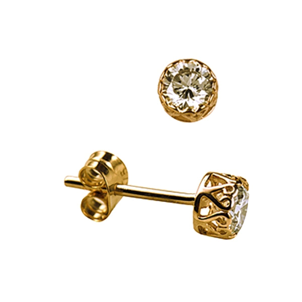 These sterling silver stud earrings feature 4mm cubic zirconia stones set within a filigree-style bezel for added detail around the stone. The decorative setting gives a more textured look while keeping a compact stud profile. A refined option for everyday wear or gifting.
