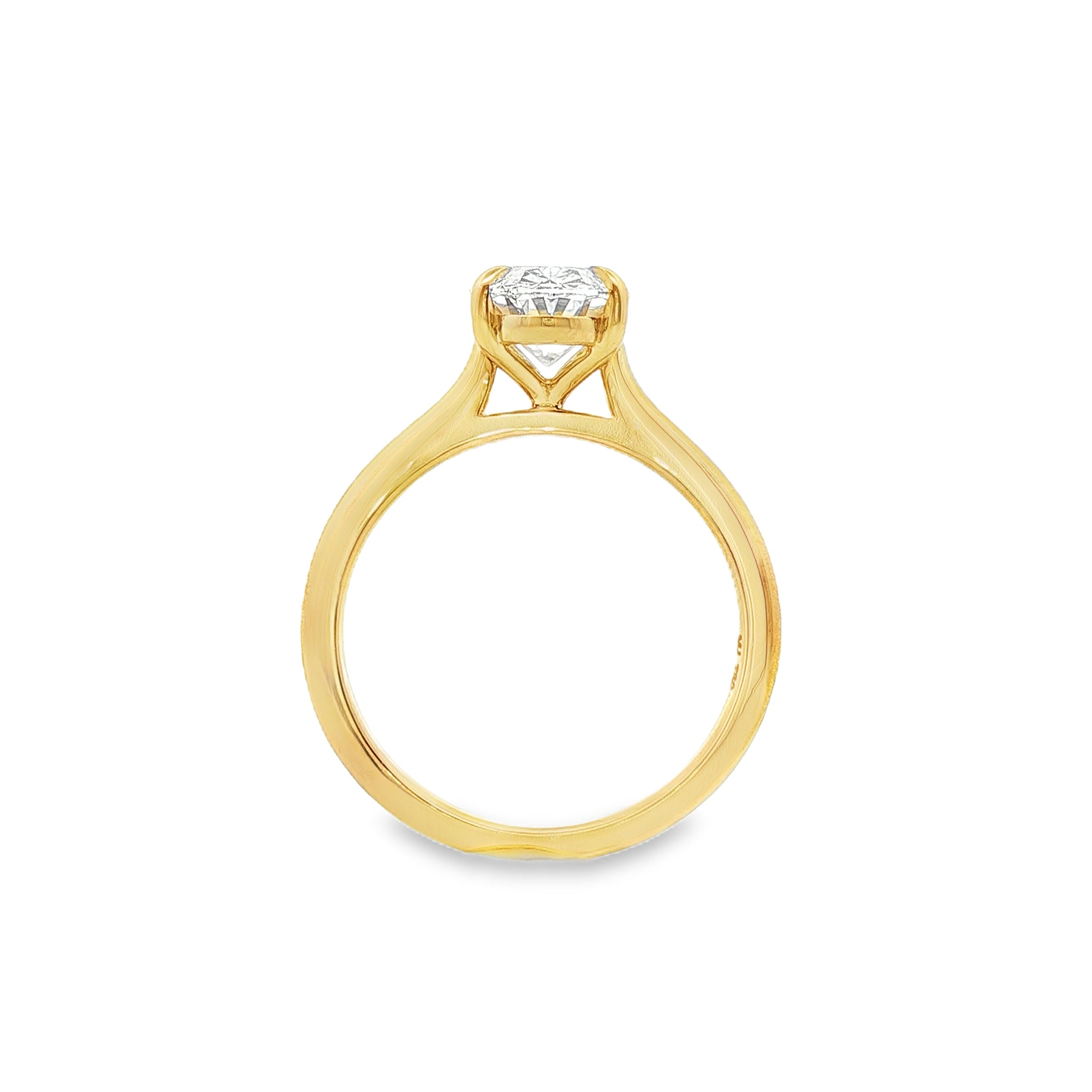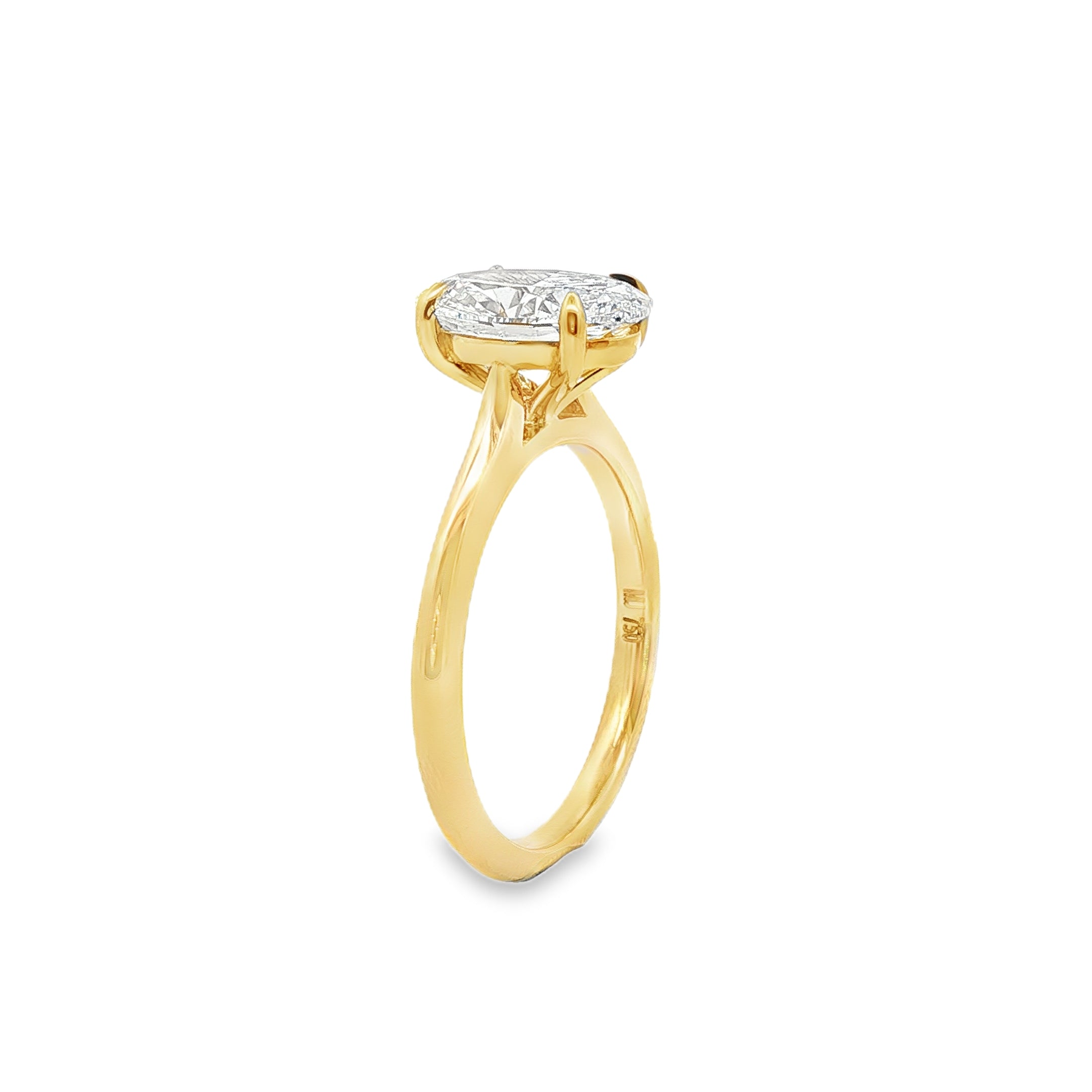 This elegant 9ct yellow gold solitaire ring showcases a 2.02ct oval cut lab grown diamond, held securely in a classic 4 eagle claw setting. Finished with cathedral-style shoulders, the design highlights the brilliance of the E VVS2 IGI certified diamond with timeless sophistication.