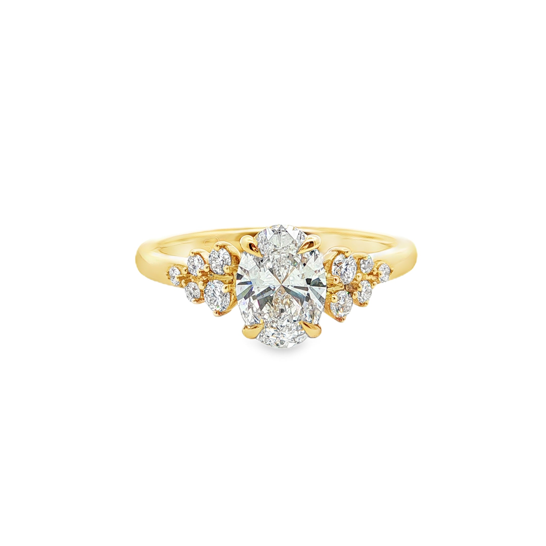 Graceful and refined, this 9ct yellow gold ring features a 1.05ct oval cut lab grown diamond secured in a classic eagle claw setting. The shoulders are enhanced with a sparkling cluster of round lab grown diamonds, adding depth and brilliance while maintaining a timeless silhouette.