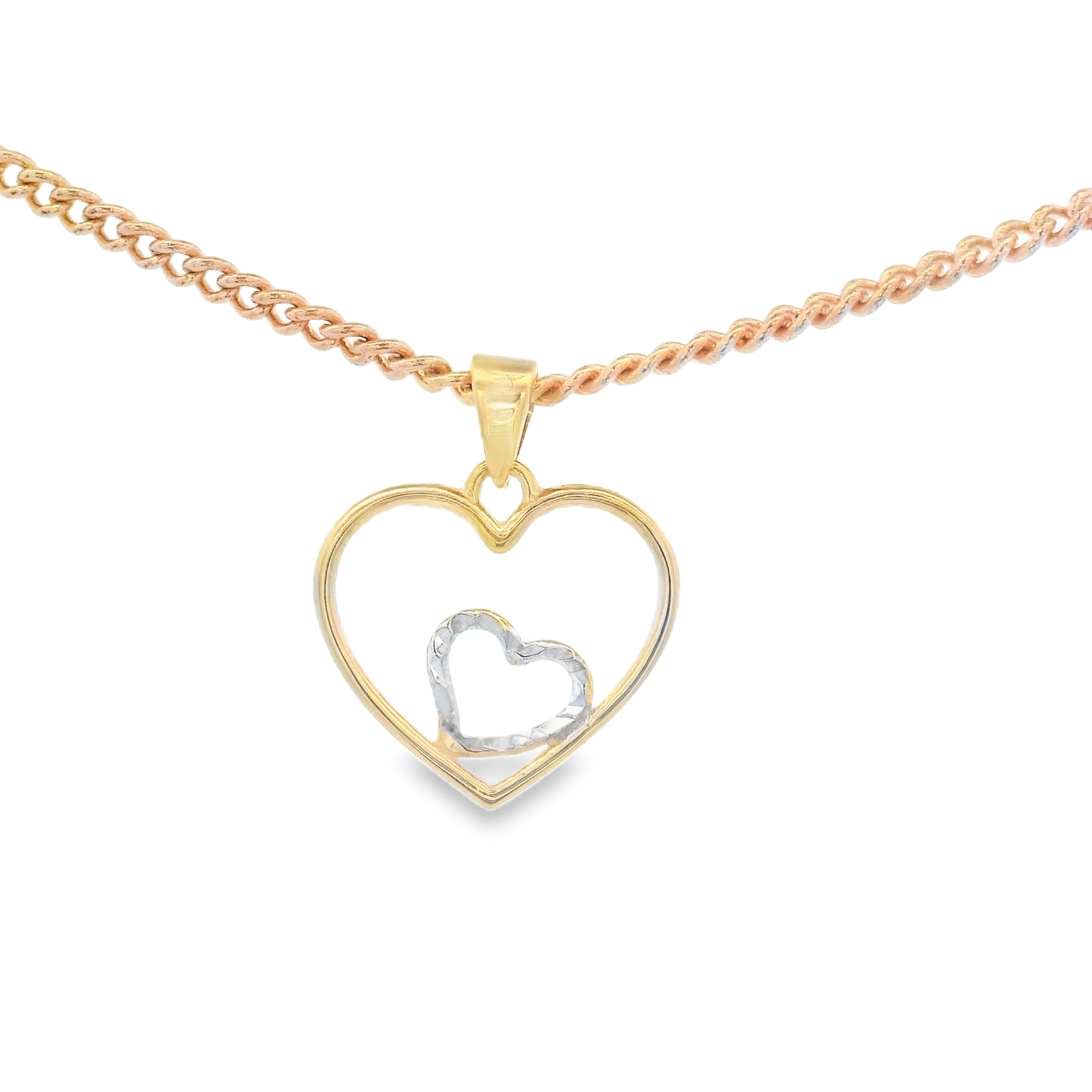 Introducing our exquisite 9ct Yellow and White Gold Heart in Heart Pendant, a beautiful symbol of love and unity. Crafted with precision from 9ct yellow and white gold, this pendant features two interlocking hearts, creating a captivating contrast and timeless elegance. Perfect as a meaningful gift or a heartfelt addition to your jewellery collection.