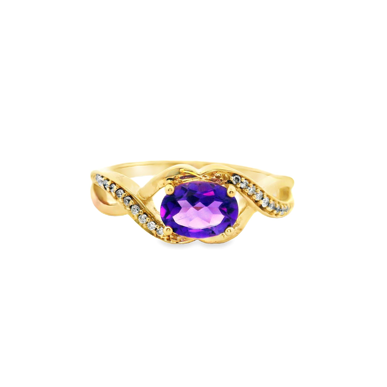This elegant ring features a 7x5mm oval-cut amethyst in a classic 4 claw setting, radiating rich purple tones. The twist split crossover shoulders are adorned with 20 sparkling round brilliant natural diamonds, adding subtle brilliance and detail to the design.