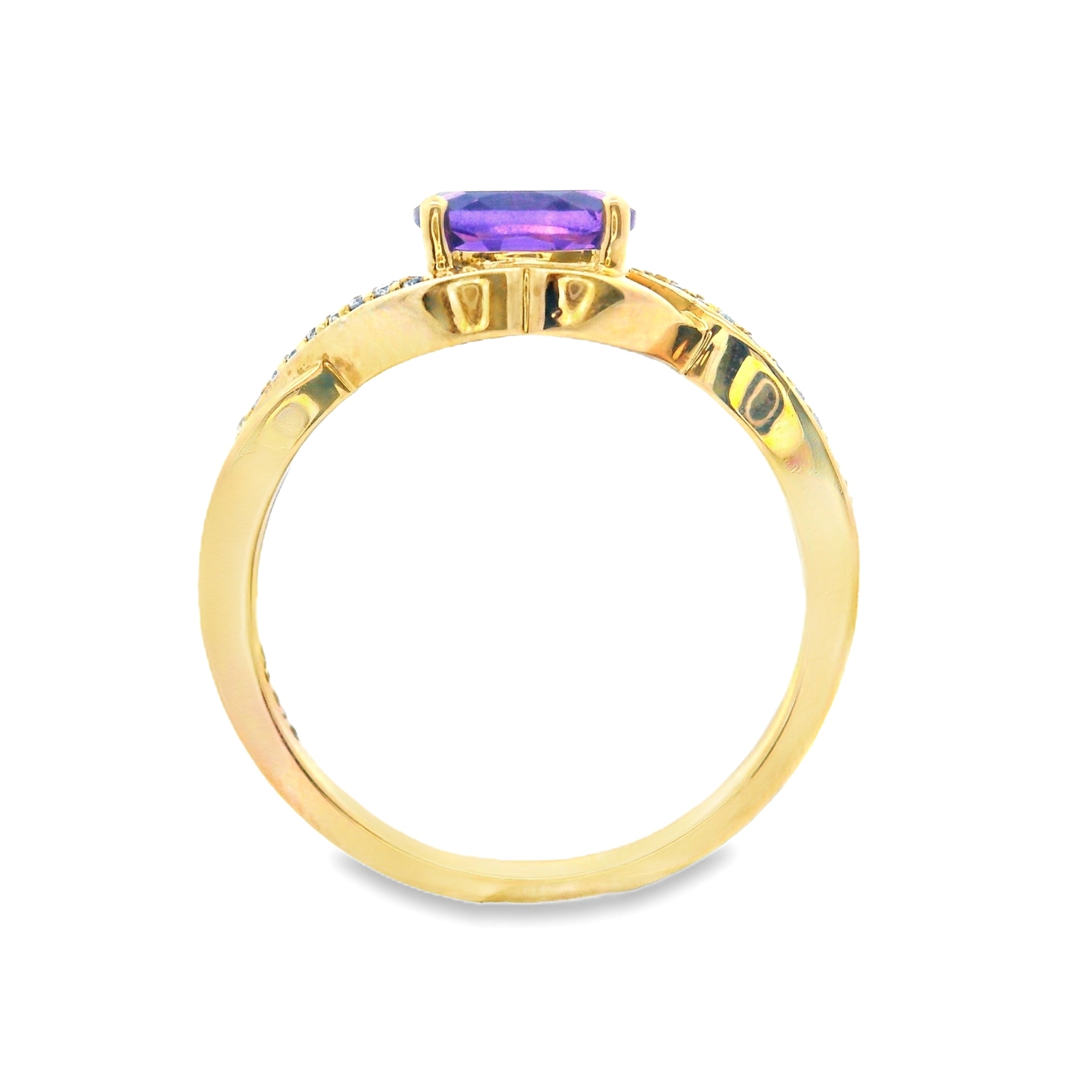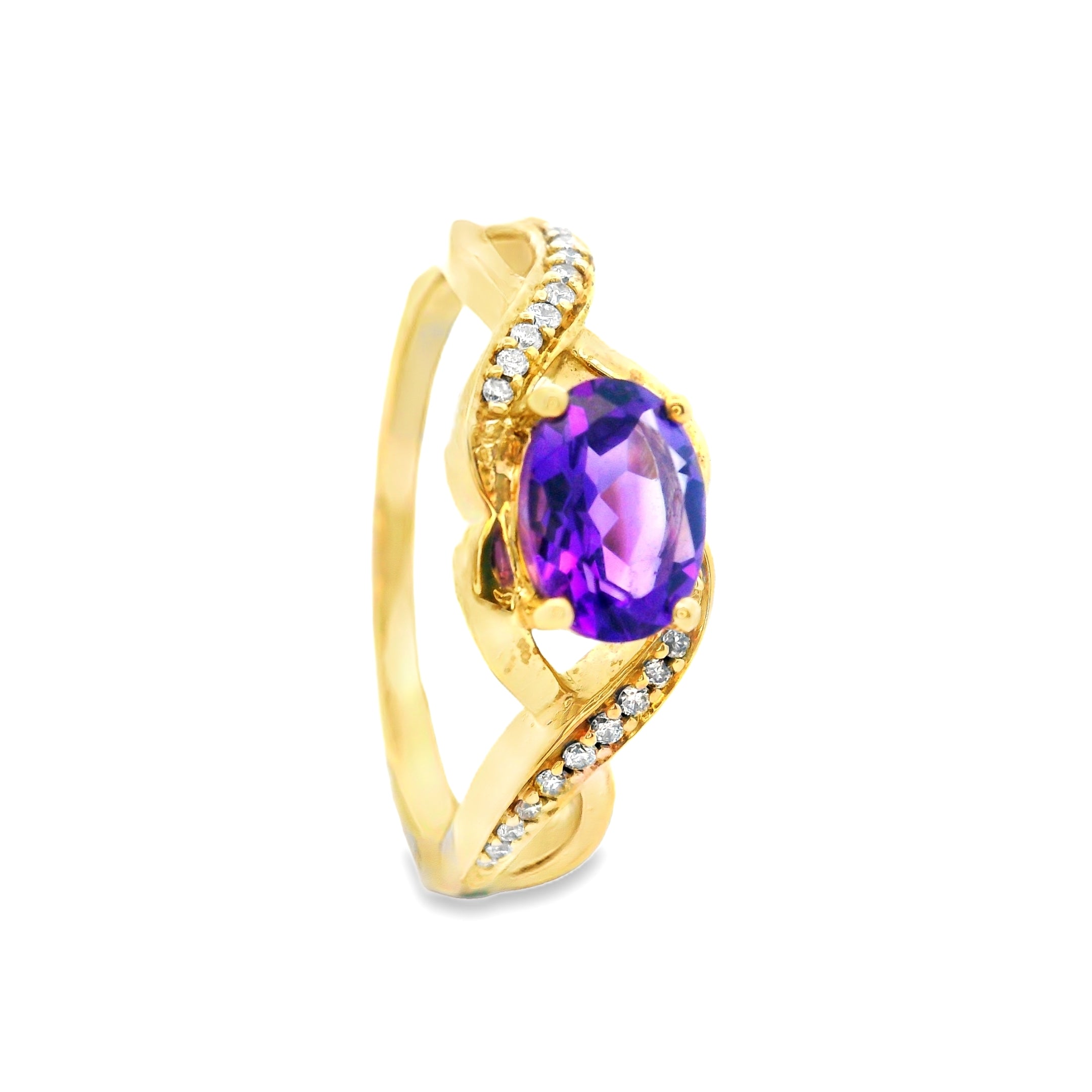 9ct Yellow Gold Oval Amethyst and Diamond Twist Shoulder Ring – 0.07ct TDW