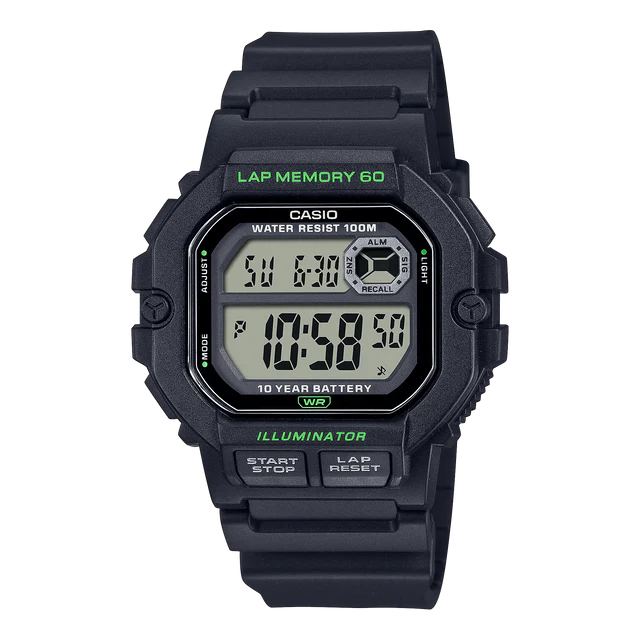 Maximise your training with this Casio digital watch, designed to keep up with your active lifestyle. Featuring a 60-lap memory, world time, dual time, and a stopwatch, it delivers all the tools you need right on your wrist. The durable black resin case and strap, combined with a clear digital display, ensure comfort and readability during any activity. With 100m water resistance, it’s perfect for swimming and snorkelling, while the multi-function alarms and countdown timer add everyday convenience.