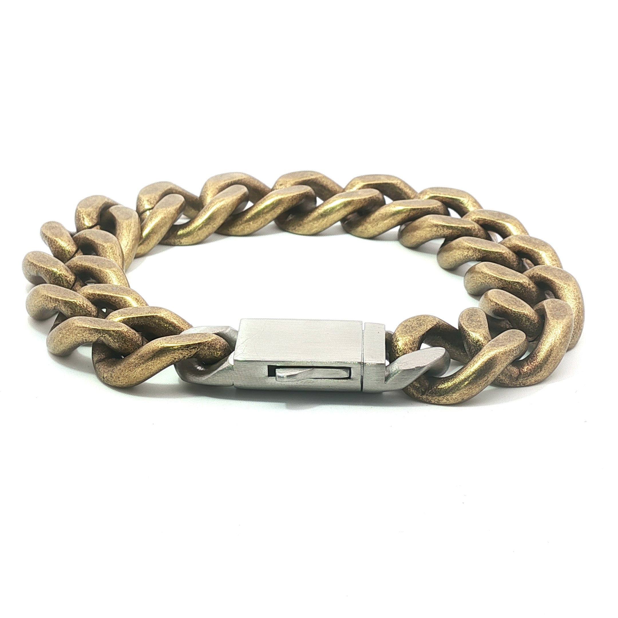 Men’s stainless steel bevelled curb bracelet with a matte bronze gold ion plated (IP) finish. Bold and modern design, perfect for everyday wear with a unique metallic edge.