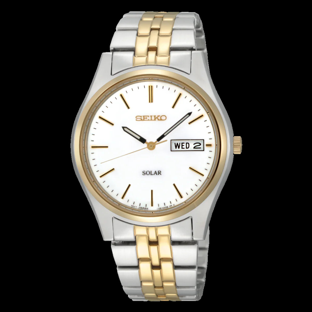 Elevate your everyday style with this Seiko Solar men’s watch, combining classic sophistication with solar-powered innovation. Featuring a round stainless steel case with yellow gold plating, this timepiece showcases a crisp white dial with gold-tone indexes and a practical date display at 3 o’clock. Built for reliability and function, it runs on light-powered Calibre V158, offering up to 10 months of power reserve. With 100 metres water resistance and a secure folding clasp, it’s ideal for both work and leisure.