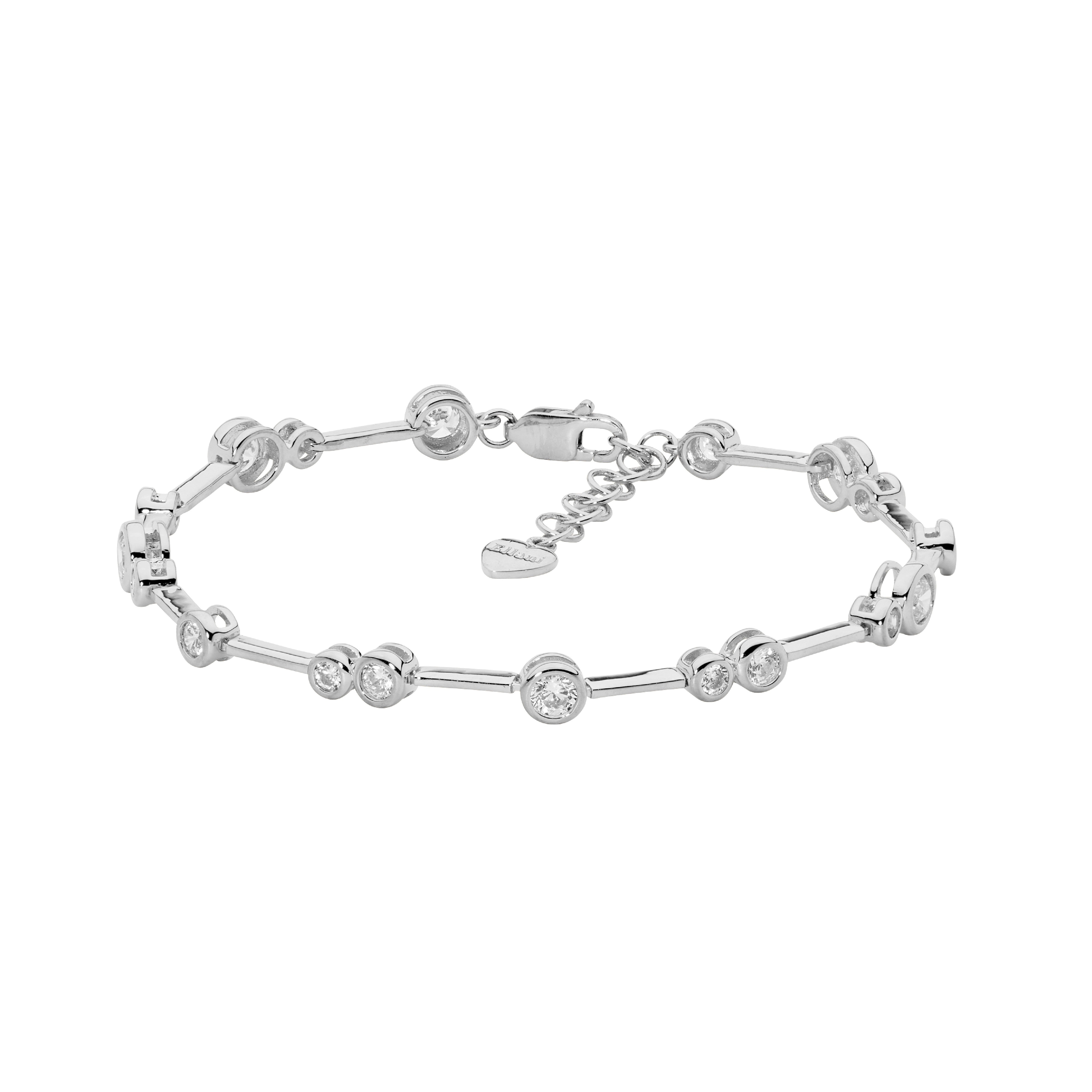 Stainless steel bar bracelet featuring bezel-set cubic zirconias and an extension chain for adjustable wear.