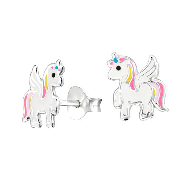 These sterling silver unicorn stud earrings are finished with yellow and pink enamel detailing and a smooth polished surface. Designed in a compact stud style, they offer a playful motif while remaining practical for regular wear. A fun addition to everyday jewellery collections.